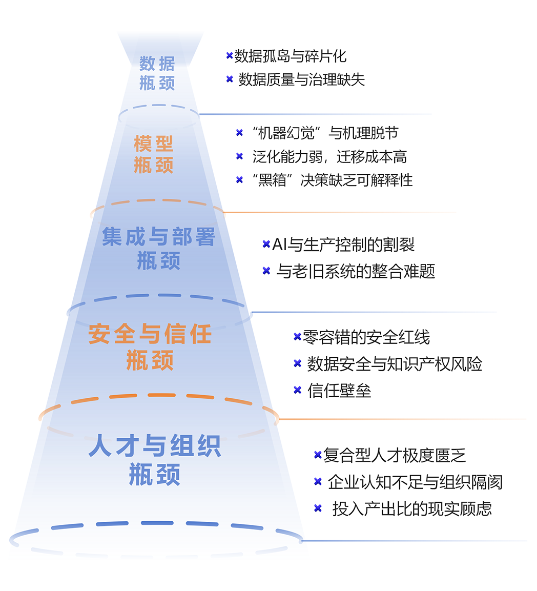針對工業(yè)AI規(guī)?;涞仉y題,溫宜明總裁直言,其瓶頸并非單一的技術(shù)難題,而是一個交織著數(shù)據(jù)、模型、系統(tǒng)、安全、人才與組織的多維度挑戰(zhàn),核心在于實現(xiàn)“可靠、可信、可解釋”的工業(yè)智能,而非簡單堆砌通用AI技術(shù)。